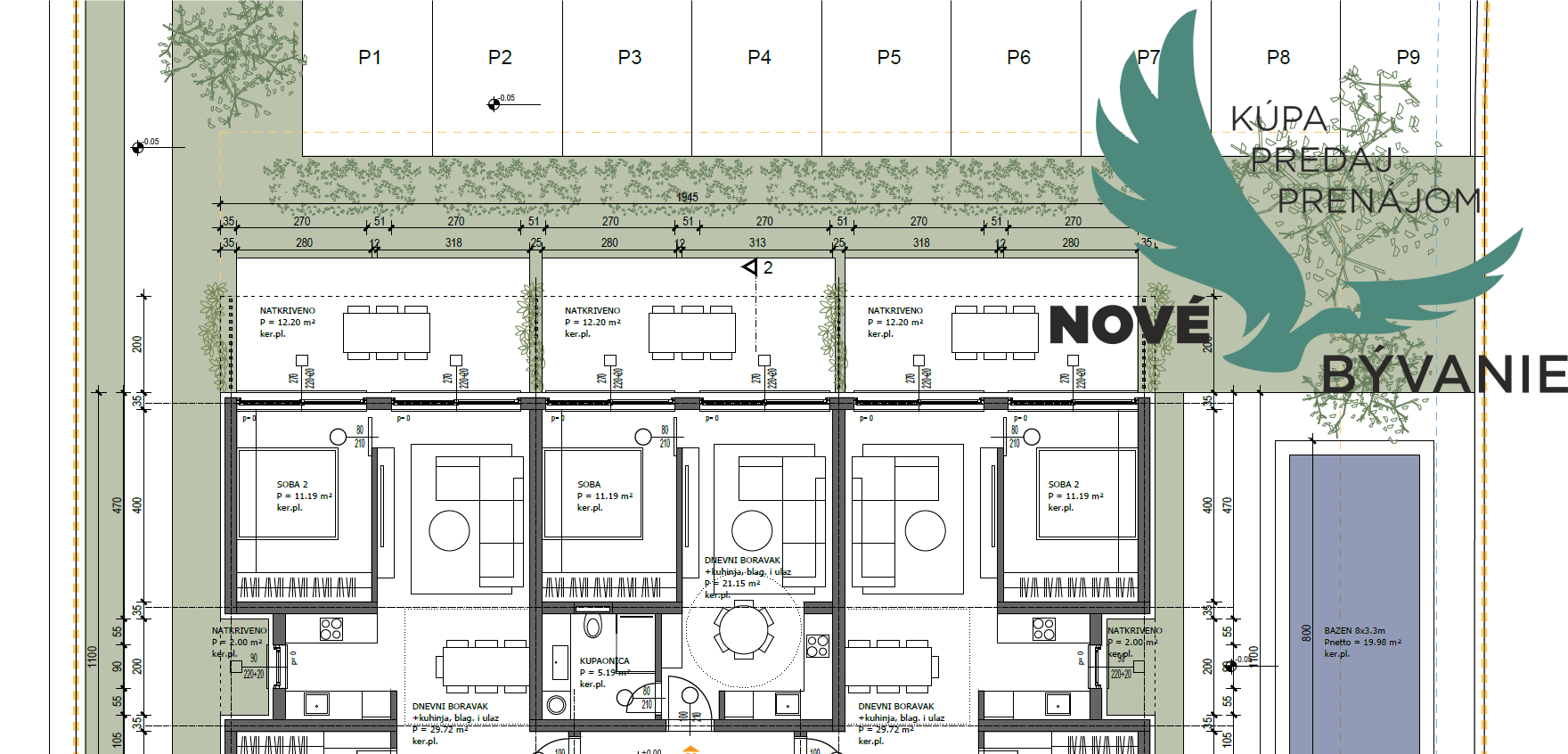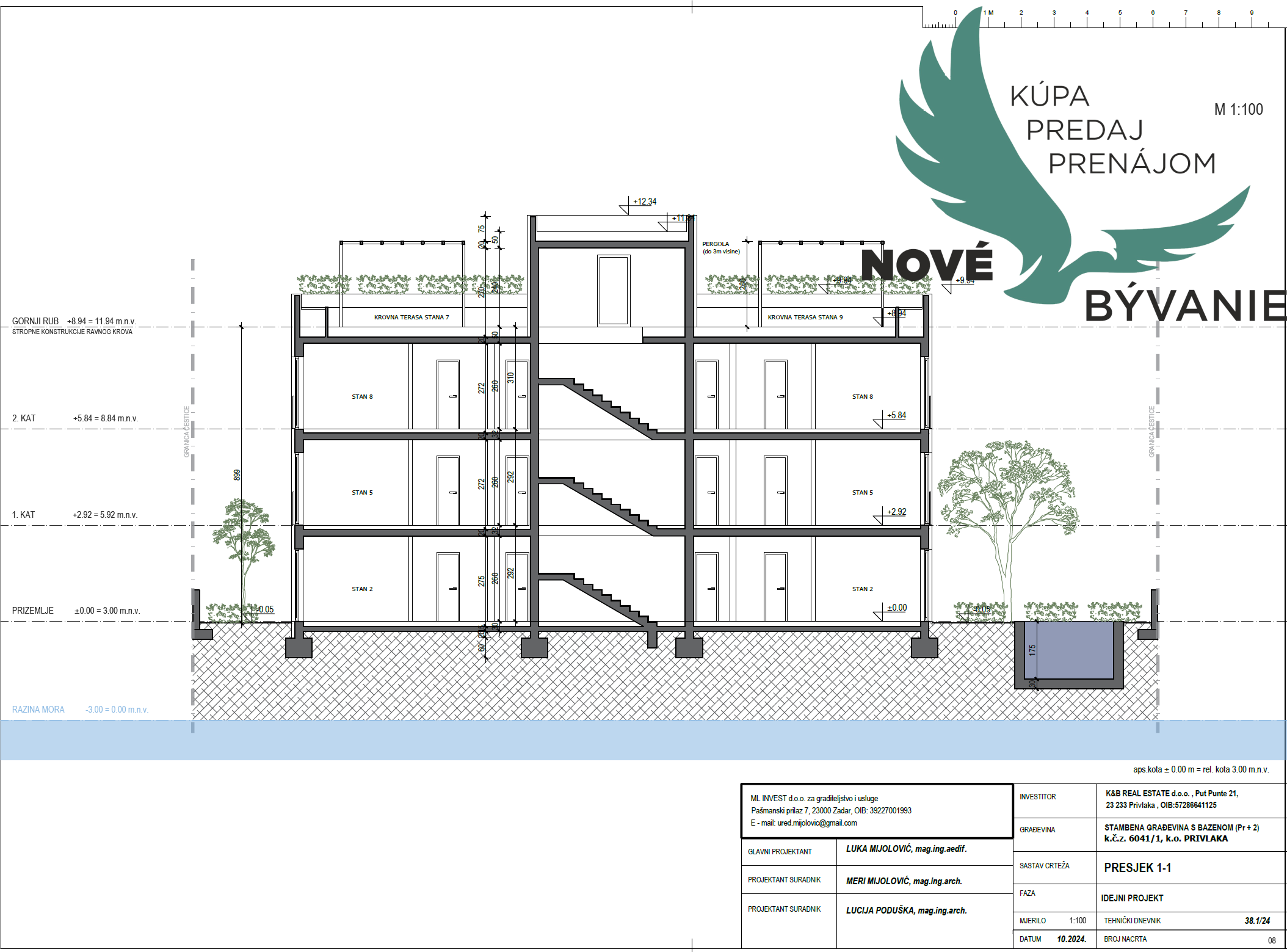 Na predaj sú tri pozemky v druhej rade od mora. Pozemok 1 má 864m2 a druhé dva pozemky majú 716m2. Na kažnom pozemku je plánovaný bytový dom. V každej budove sa nachádza 9 bytov na každom poschodí dva 3izbové a jeden 2izbový. Na prízemí sú plánované bazény. Ku bytom na druhom poschodí pripadá strešná terasa s výhľadom na more.