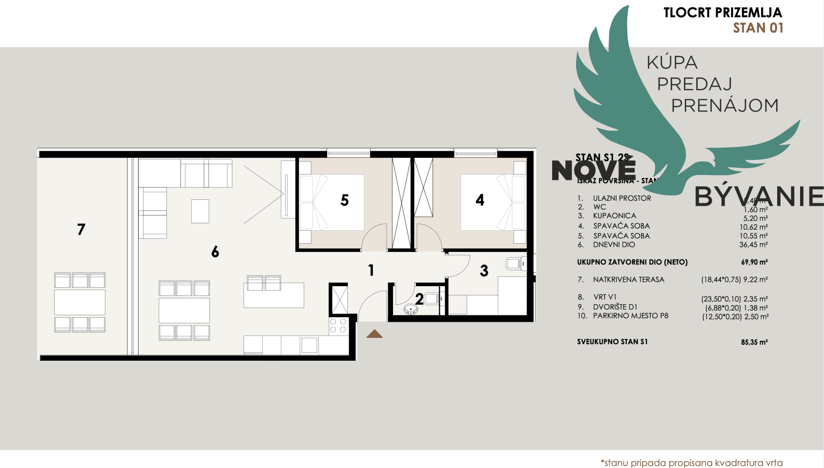 Apartmán S1 sa nachádza na prízemí exkluzívnej novostavby v tichej časti Privlaky, len 50 metrov od krásnej piesočnatej pláže v druhom rade pri mori. Ide o luxusný apartmán s celkovou čistou plochou 85,35 m², zatiaľ čo hrubá plocha so všetkým príslušenstvom je 131,22 m². Apartmán pozostáva z priestrannej kuchyne prepojenej s jedálňou a obývacou izbou, dvoch pohodlných spální, kúpeľne, ďalšej toalety a krytej terasy, ktorá poskytuje pokoj a súkromie. K apartmánu patrí záhrada o rozlohe 30,38 m² a jedno vonkajšie parkovacie miesto, čo ďalej prispieva k pohodliu a praktickosti každodenného života.