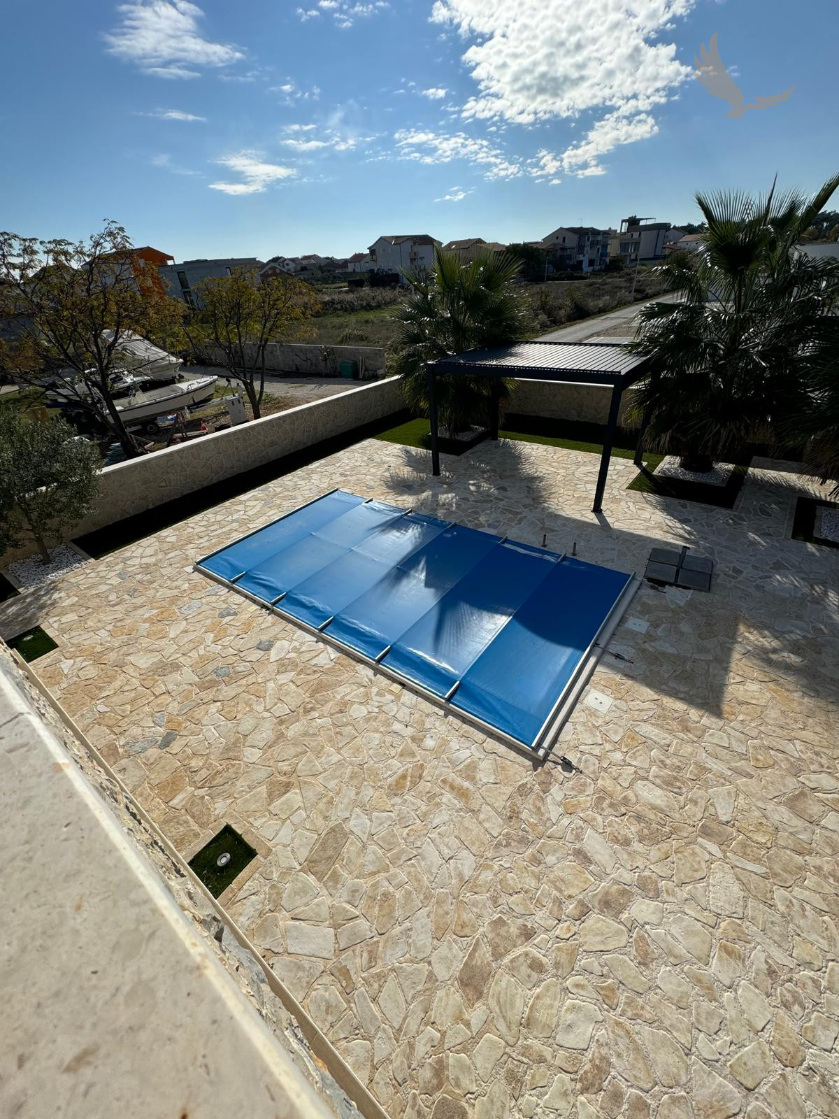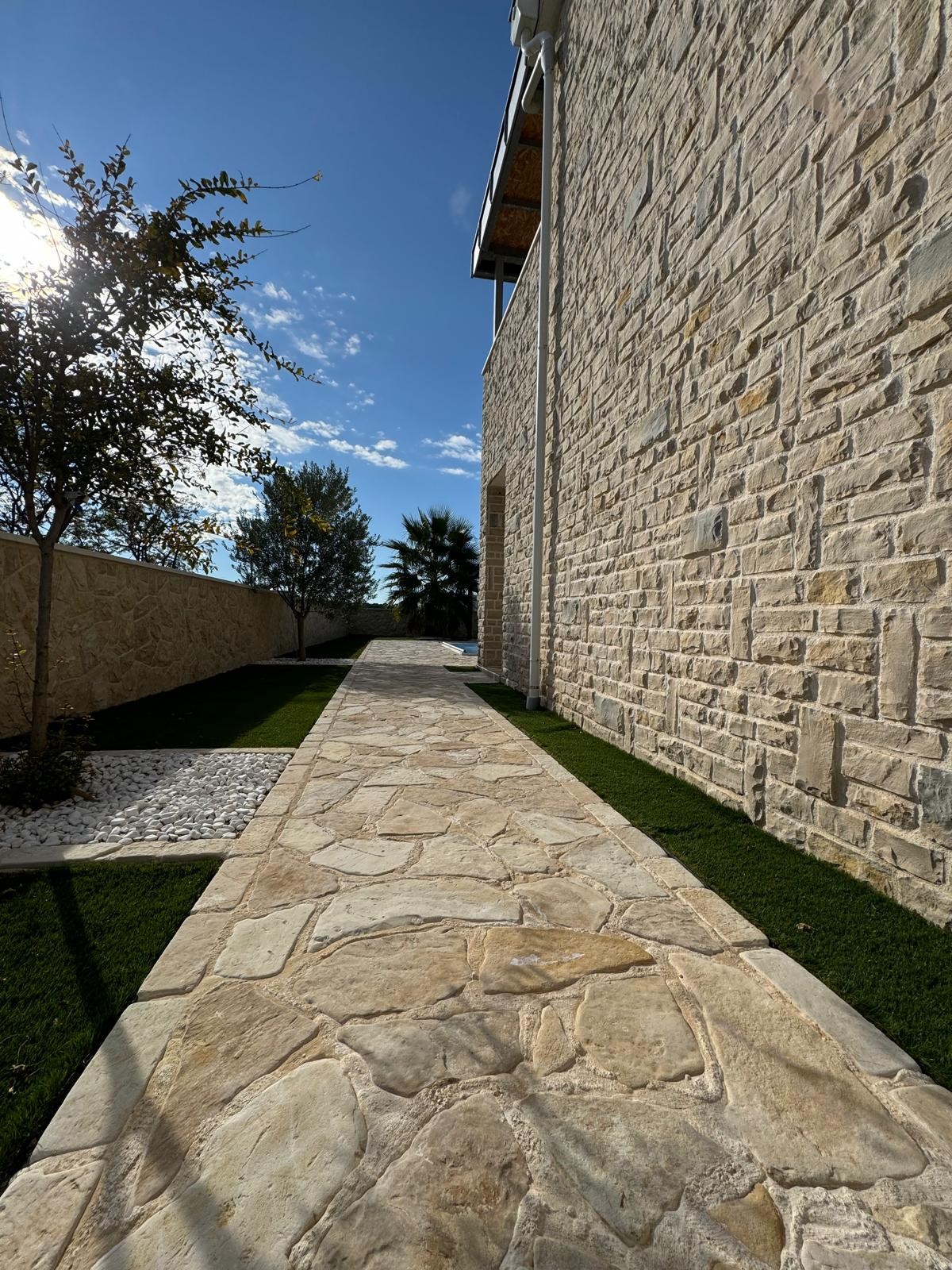 Upravený dvor s palmami a olivovníkmi.