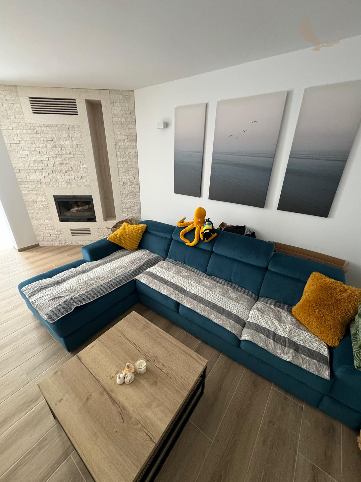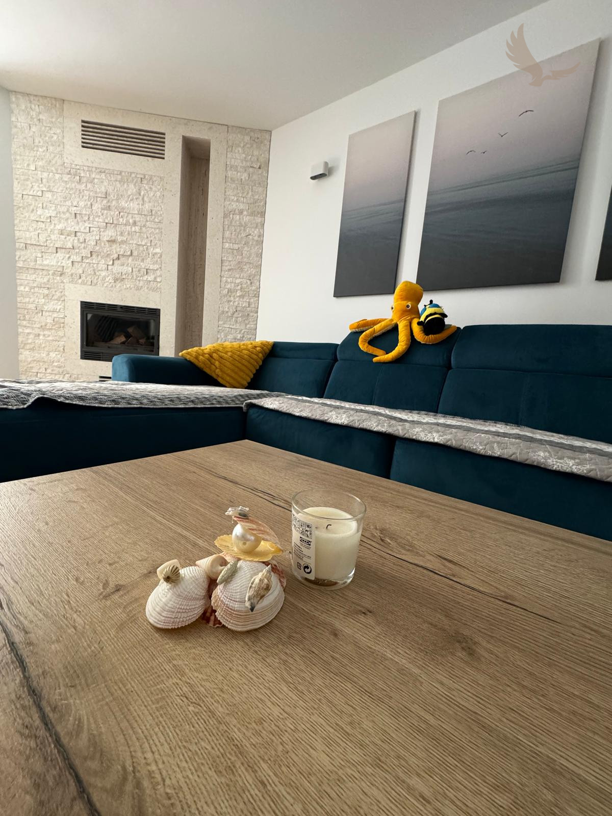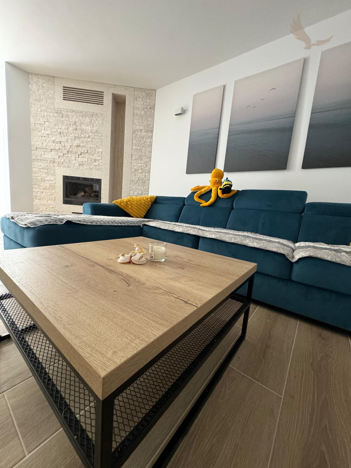 Priestranná obývacia izba s funkčným krbom, ktorý vytvára útulnú atmosféru ideálnu aj pre chladnejšie mesiace.