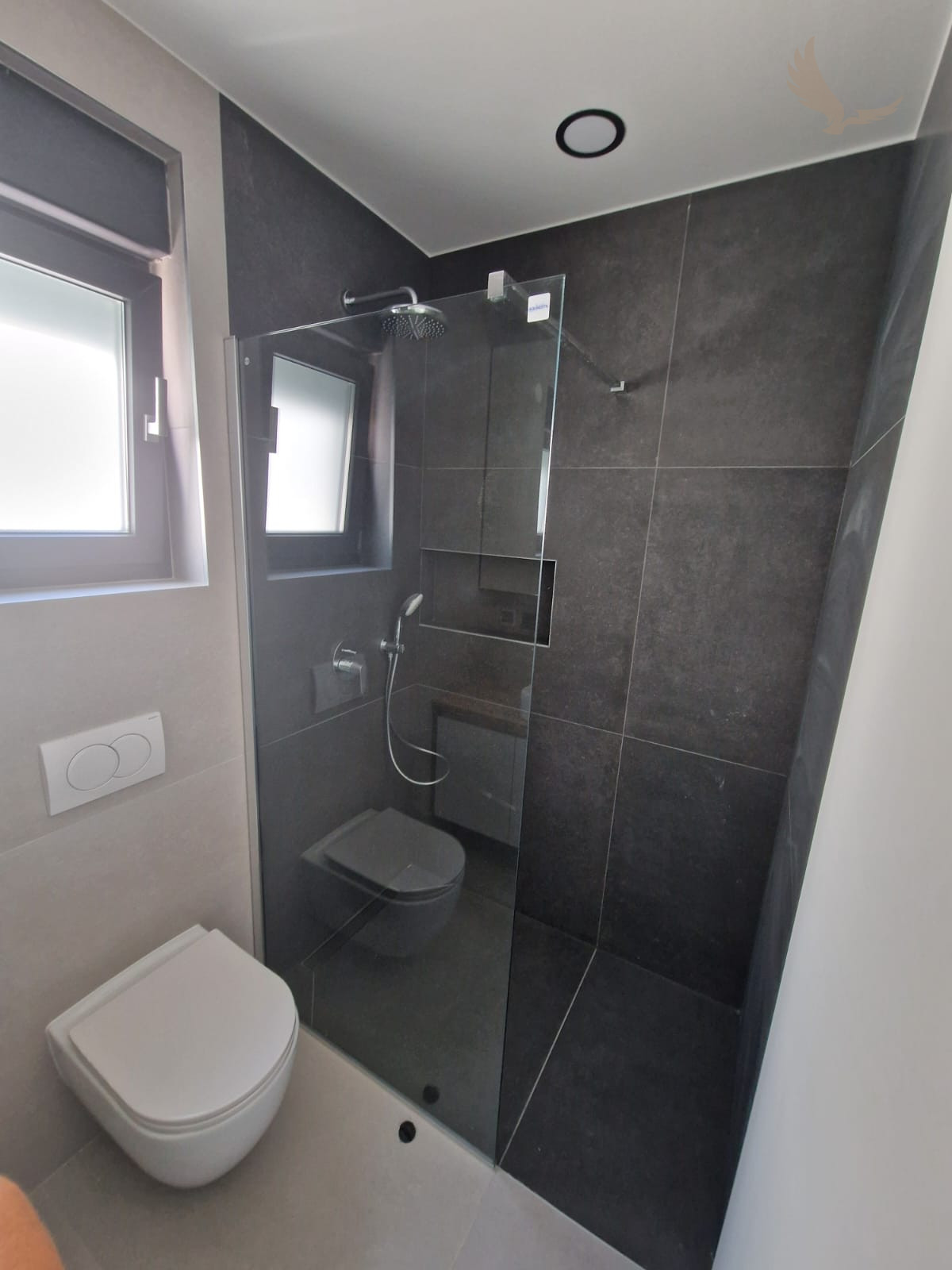 Kvalitné plastové okná v antracitovej farbe s trojvrstvovým sklom, elektrické žalúzie, siete proti hmyzu.