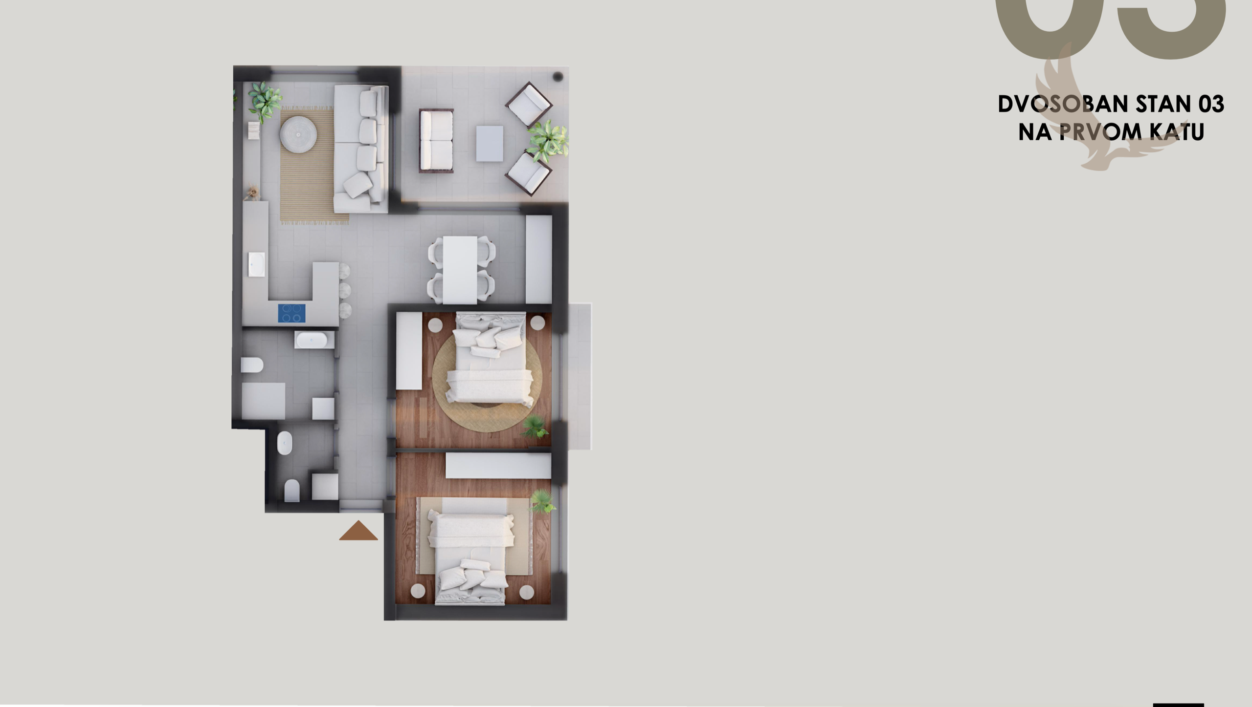 Apartmán s celkovou rozlohou 77,20 m² ponúka dokonalú kombináciu luxusu, súkromia a funkčnosti. Pozostáva zo vstupnej haly, priestrannej obývačky s jedálňou, kuchyne, chodby, kúpeľne, toalety, dvoch spální, krytej terasy a nekrytej terasy.