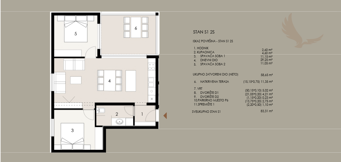 Ma rozlohou 83,31 m², pozostáva z: chodby, kúpeľne, dvoch spální, priestrannej obývačky s kuchyňou a jedálňou v otvorenom koncepte, krytej terasy a záhrady.