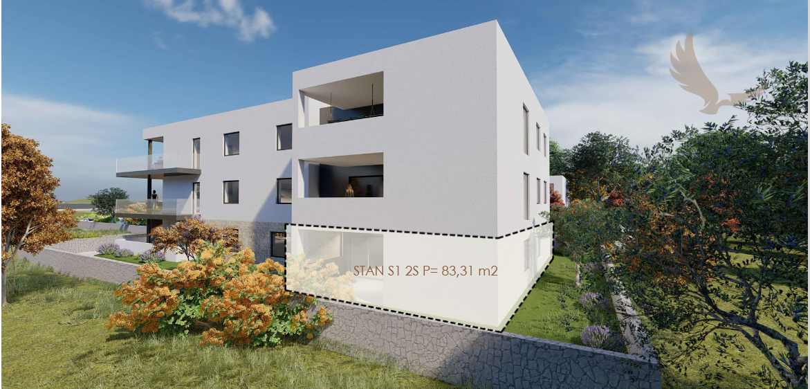 Atraktívny apartmán S1, ktorý sa nachádza na prízemí moderného bytového domu vo výnimočnej lokalite v Privlake, len 50 metrov od mora a udržiavanej piesočnatej pláže.