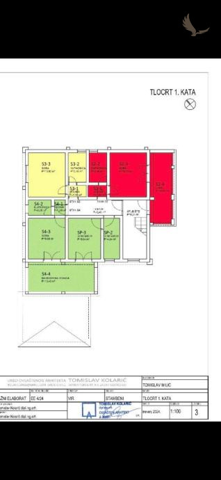 Byty na pôdoryse sú označené červenou a žltou farbou JE MOŽNÉ KÚPIŤ OBA BYTY, PRETOŽE SÚ VEDĽA SEBA. MAJÚ 100 m² POZEMOK, KTORÝ MÔŽE SLÚŽIŤ AKO ZÁHRADU A PARKOVACIE MIESTO.